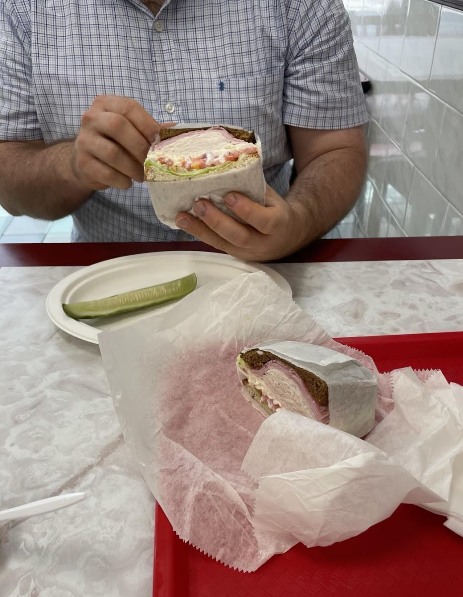 Great little local sandwich shop right near South Station. Great for a grab and go sandwich or a brief sit down on the way to Amtrak. My wife and I got the Bostonian sandwich, half light rye, half dark rye. Turkey, ham, salami with Cole slaw and all the standard veggies. Good deli pickles too. A little under $12 per person after tax.